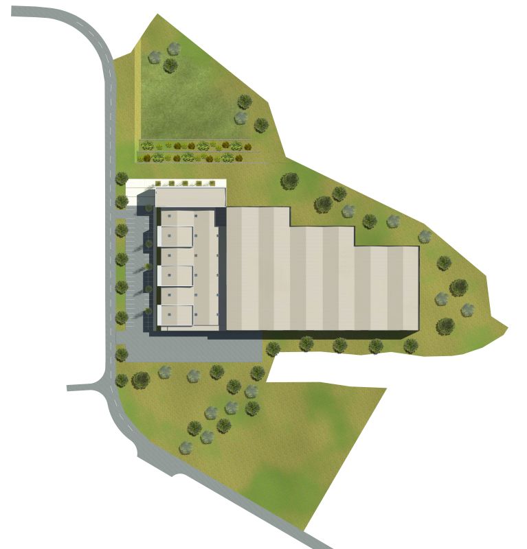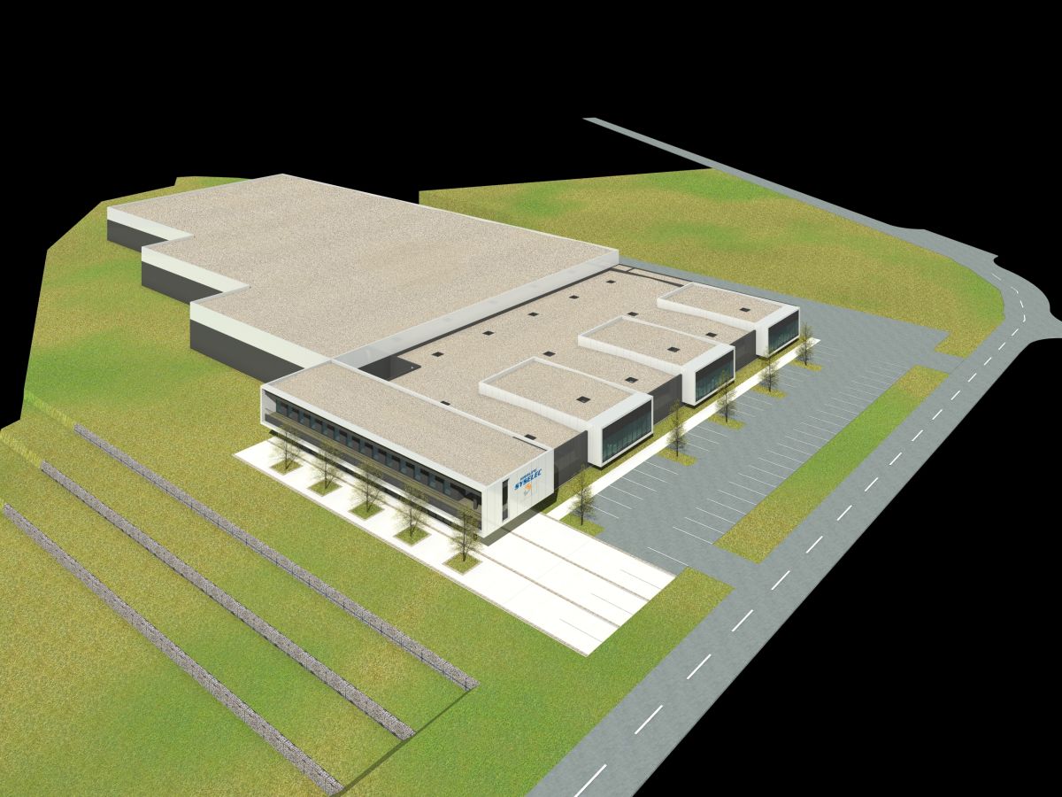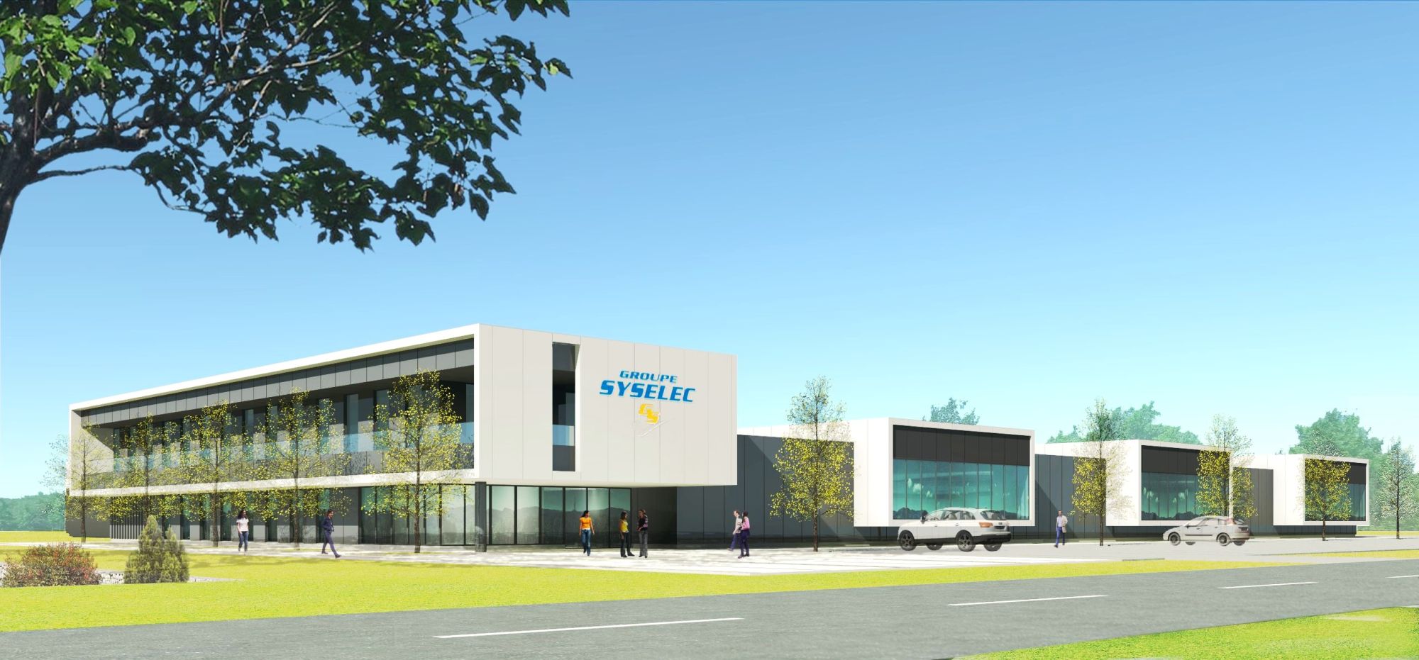 L’architecture du bâtiment se caractérise par une écriture résolument contemporaine et rigoureuse, fondée sur des volumes simples, alignés et parfaitement maîtrisés. L’ensemble adopte une composition horizontale forte : un long volume principal, largement vitré au rez-de-chaussée comme à l’étage, organise la façade autour d’un rythme régulier de trames et de montants verticaux. Cette transparence abondante confère au bâtiment une image ouverte, moderne et technologique, en parfaite adéquation avec l’univers d’une entreprise industrielle ou innovante.