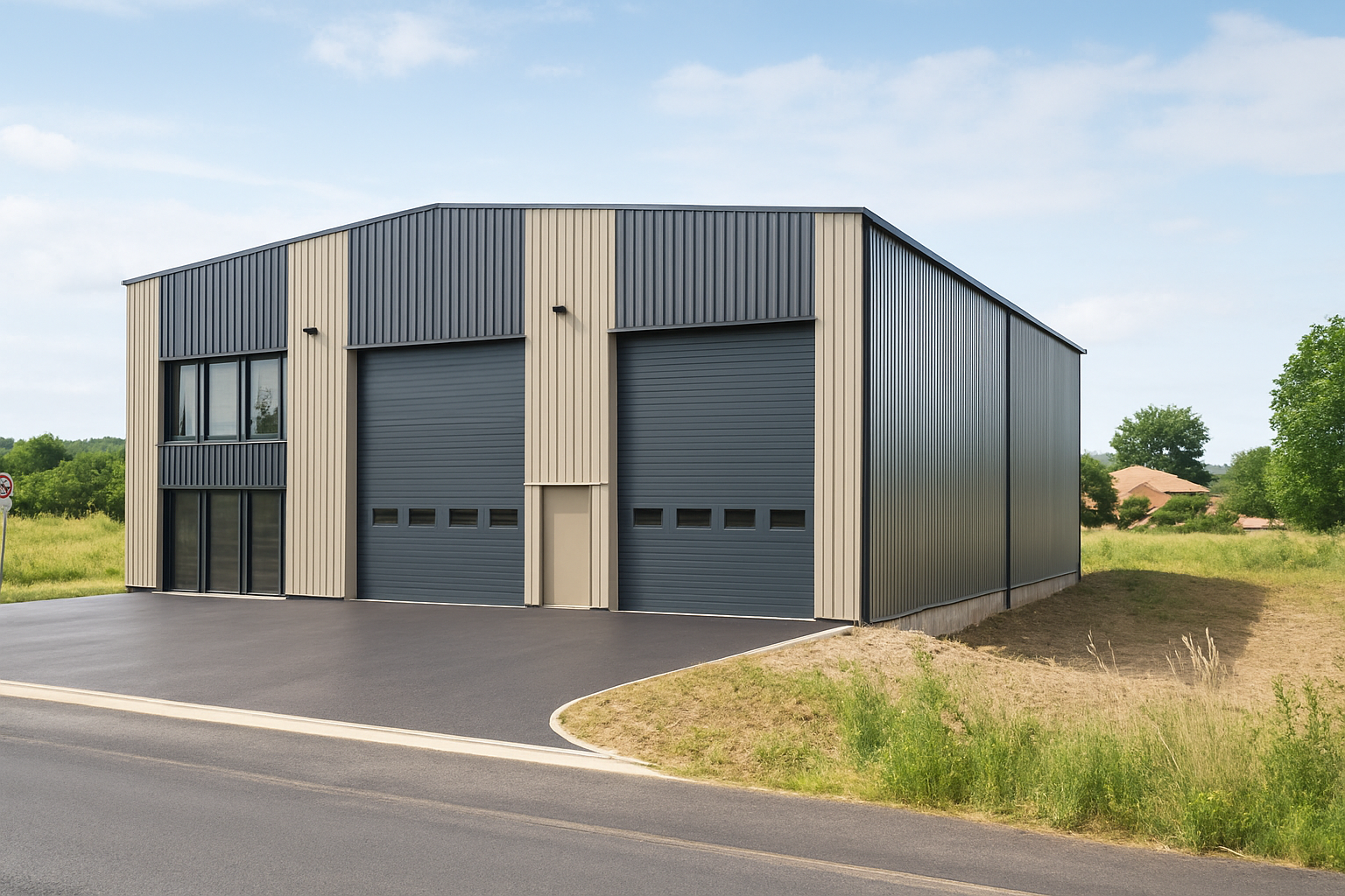 La façade principale se distingue par une composition rythmée de bardages métalliques bicolores, alternant un gris anthracite et un beige clair. Ce contraste donne du relief et une identité visuelle élégante au bâtiment. Les deux grandes portes sectionnelles situées au centre assurent un accès aisé aux véhicules ou aux équipements, tandis qu’une porte piétonne est discrètement intégrée entre elles.