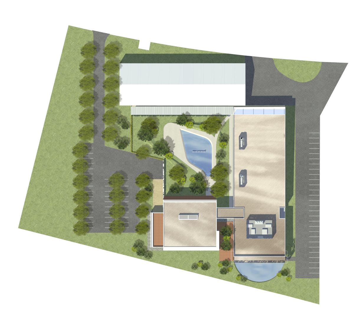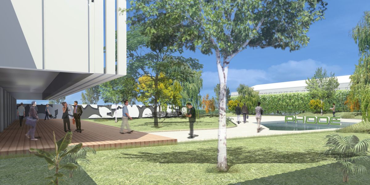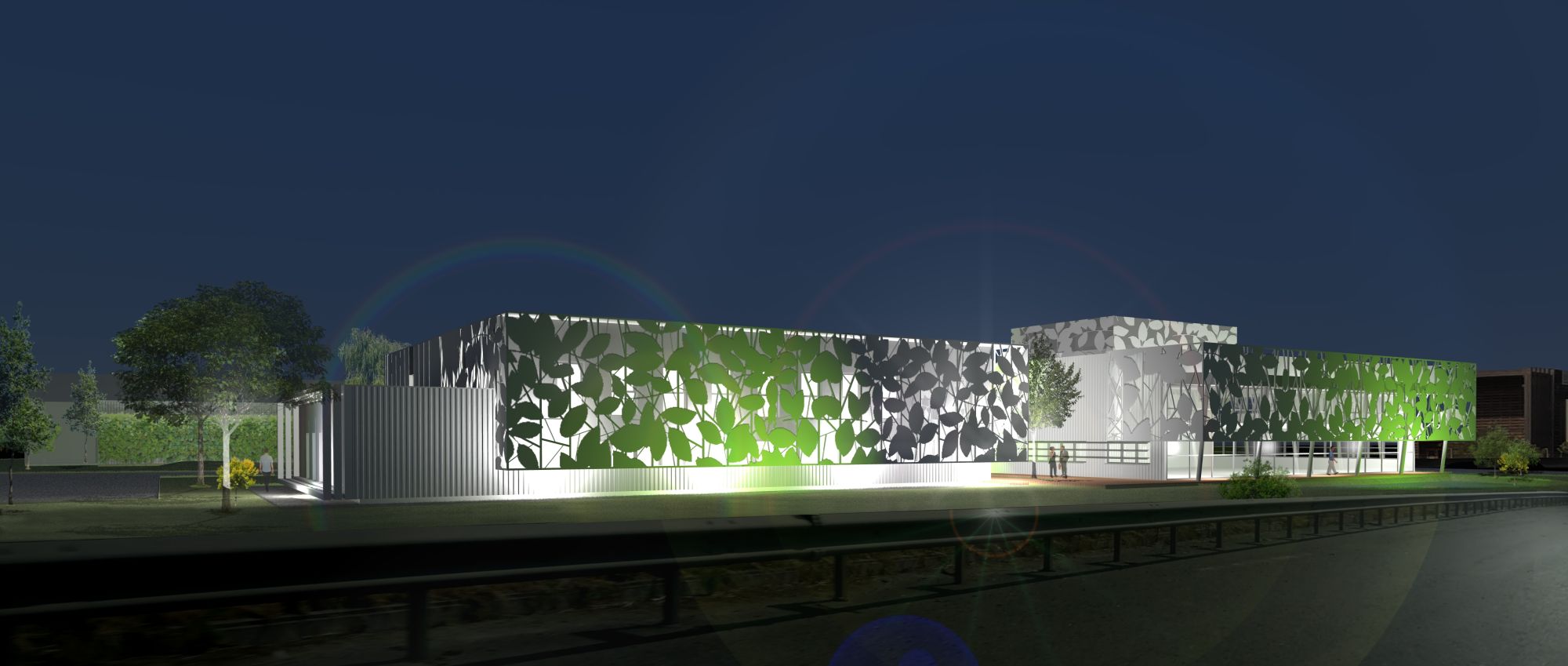 L’ensemble forme un bâtiment à la fois rigoureux et sensible, capable de traduire l’identité de PHODE : une entreprise tournée vers l’innovation, la recherche et l’interaction entre science et perception. Par son écriture architecturale contemporaine et son intégration maîtrisée, le projet offre une image claire, sobre et durable, au service de l’activité et du rayonnement de l’entreprise. La façade se distingue par un parement perforé à motifs minéraux, composé de grandes formes organiques. Cette peau métallique, appliquée en second plan devant le bardage, crée un effet de dentelle contemporaine qui joue subtilement entre opacité et transparence.