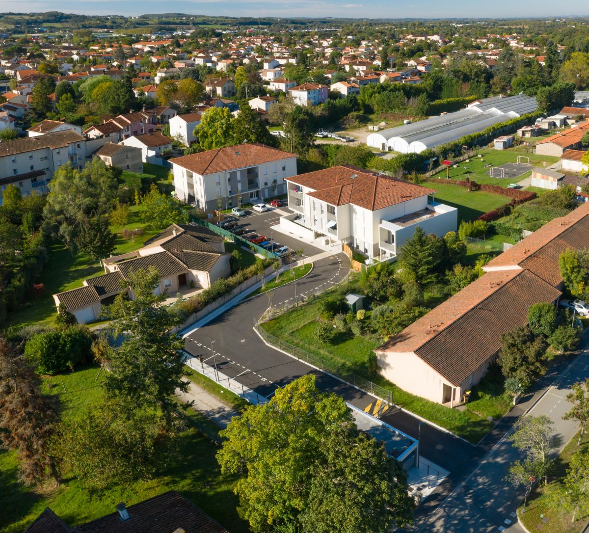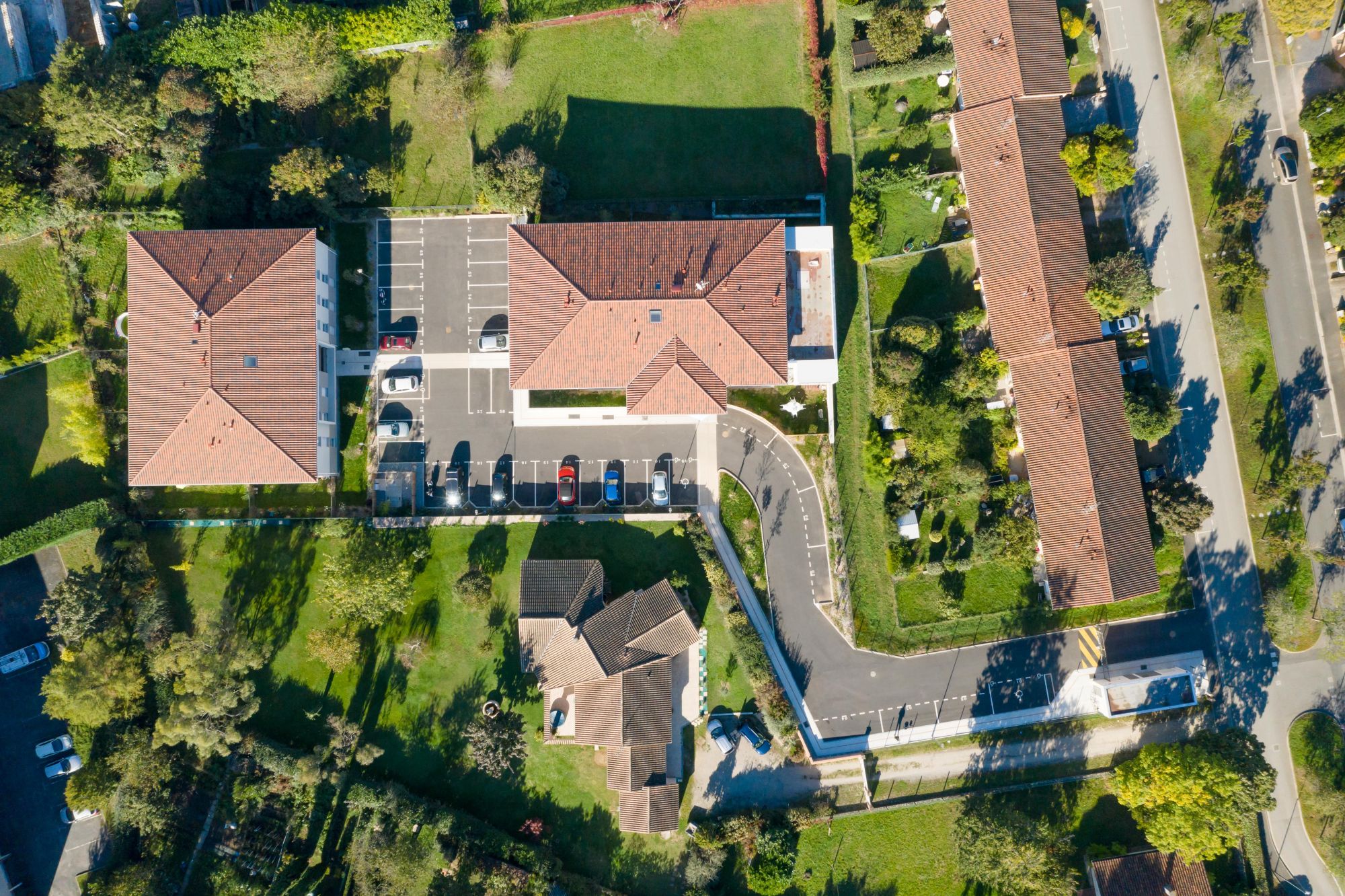 L’ensemble immobilier s’inscrit au cœur d’un paysagement arboré, structuré par des espaces verts généreux qui accompagnent les cheminements et contribuent à la mise en scène des accès.